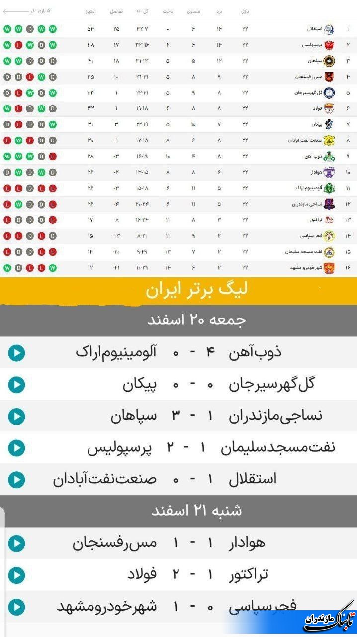 به گزارش تابناک مازندران، نتایج و جدول رده‌بندی لیگ برتر فوتبال پس از پایان هفته بیست و دوم به این شرح است.