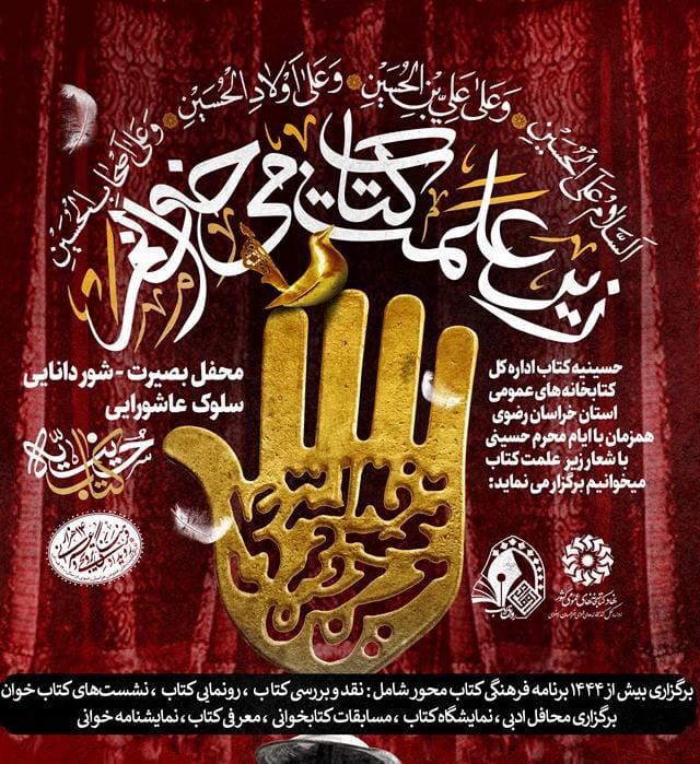 مدیرکل کتابخانه های عمومی خراسان رضوی با بیان اینکه امسال نیز همچون سالیان گذشته ویژه برنامه «حسینیه کتاب» برگزار می شود، افزود: این بار نیز همچون گذشته با شعار «زیر علمت کتاب می خوانم» کتابخانه های عمومی استان میزبان بالغ بر 1444 برنامه فرهنگی کتاب همچون نقد و بررسی کتاب، رونمایی کتاب، نشست های کتابخوانی، برگزاری محافل ادبی، نمایشگاه کتاب، مسابقات کتابخوان، معرفی کتاب، نمایشنامه خوانی و ... هستند.