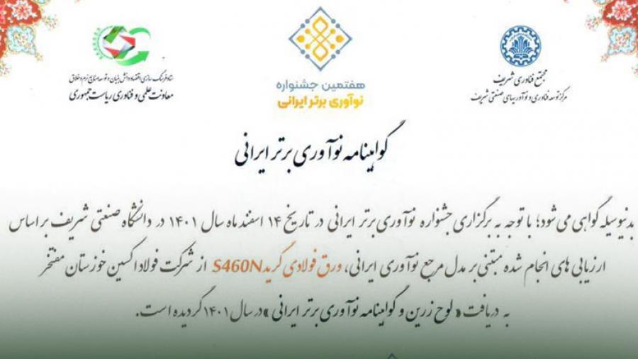 در جشنواره نوآوری برتر ایرانی، ورق عریض فولادی تولید شده با گرید S۴۶۰N در شرکت فولاد اکسین خوزستان به عنوان نوآوری برتر ایرانی انتخاب شد.