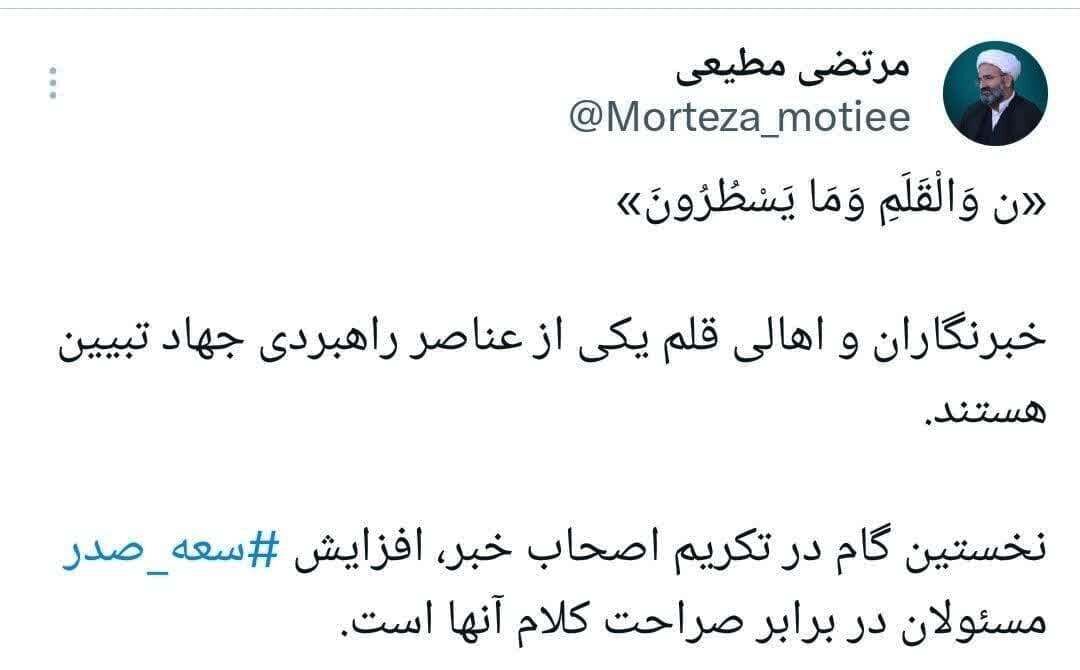 به گزارش تابناک سمنان به نقل از ایرنا، حجت الاسلام و المسلمین مرتضی مطیعی روز سه شنبه در توئیتی با اشاره به آیه «ن وَالْقَلَمِ وَ مَا یَسْطُرُون؛ نون، سوگند به قلم و آنچه می ‏نویسند» از سوره «قلم» افزود: نخستین گام در تکریم اصحاب خبر، افزایش سعه‌صدر مسئولان در برابر صراحت کلام آن‌ها است.