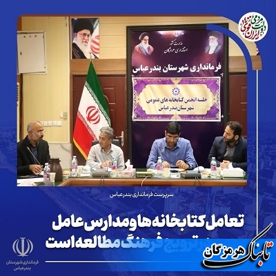 تابناک هرمزگان-فرماندار بندرعباس در اولین جلسه انجمن کتابخانه‌های عمومی گفت: تعامل کتابخانه‌ها و مدارس عامل مهمی در ترویج فرهنگ مطالعه است.