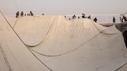 او گفت: جوانان همراه و همزمان با فریاد "یاحسین” پیشکسوتان هیئت، پوش حسینیه را به سمت بالا میکشند و طنابها را به اطراف محکم میکنند.