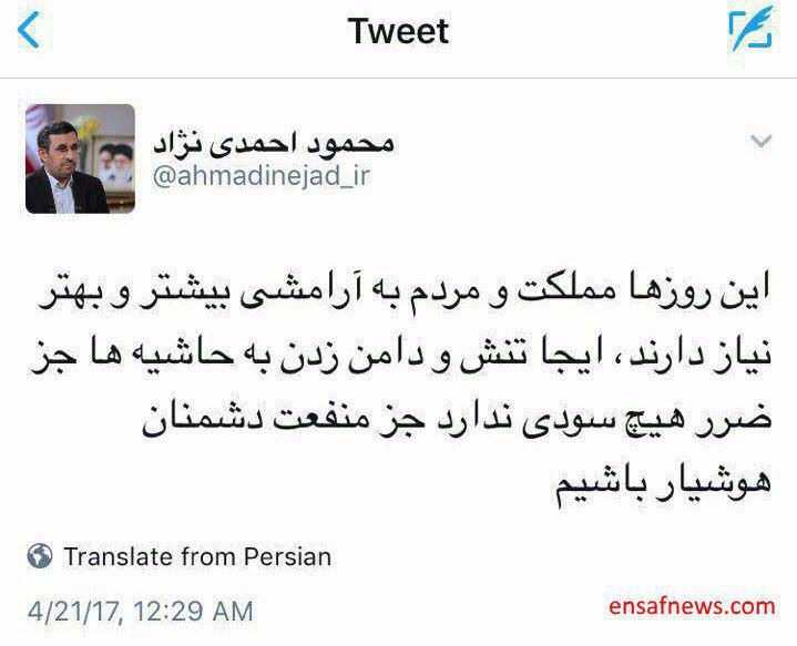 محمود احمدی نژاد هم پس از عدم احراز صلاحیتش در توییتر پرهیز از هرگونه تنش را مورد تاکید قرار داده است.