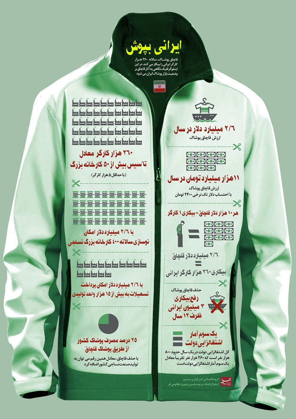 قاچاق پوشاک سالانه 260 هزار کارگر ایرانی را بیکار می کند. اینفوگرافیک زیر به بررسی آثار سوء قاچاق بر صنعت پوشاک کشور پرداخته است.