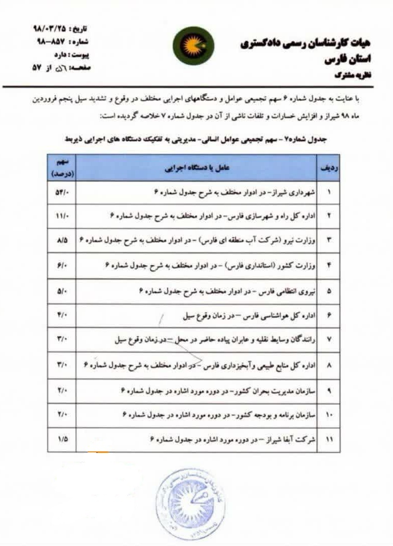 4- عدم نظارت کافی بر اقدامات شهرداری در انجام مطالعات و مرحله تصویب طرح مجرای زیرسطحی انتقال سیل در سال 1366 به رغم مسئولیت، دستگاه اجرایی مرتبط استانداری فارس در زمان انجام مطالعات و تصویب طرح در سال 1366، سهم عامل 2 درصد.