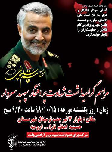مراسم گرامیداشت شهید حاج قاسم سلیمانی در نقاط مختلف آذربایجان غربی برگزار می شود .