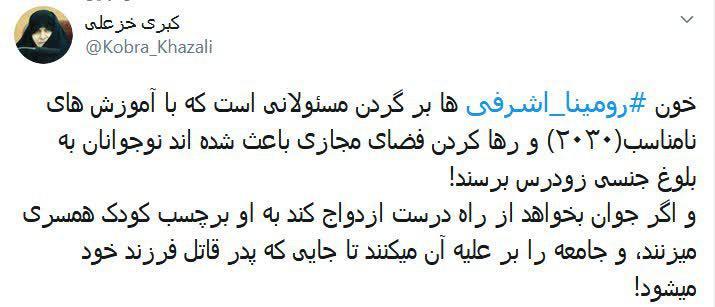 کبری خزعلی عضو شورای عالی انقلاب فرهنگی در صفحه شخصی خود در توییتر از دادستانی خواستار برخورد با قاتل رومینا اشرفی شد.