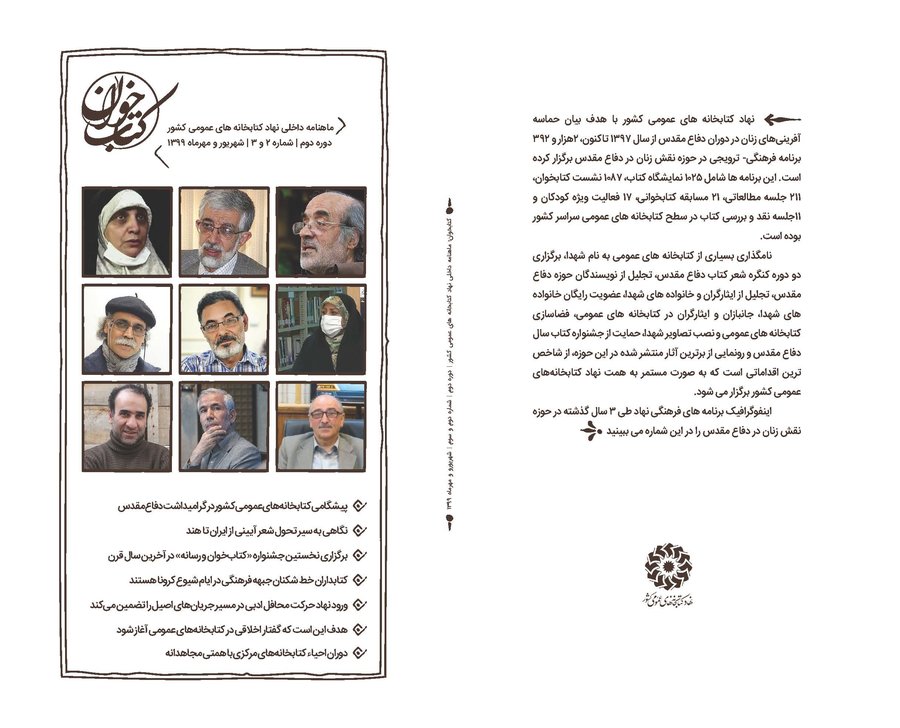 وی خاطرنشان ساخت:بخش «فرهنگی» به گزارش برگزاری سوگواره مجازی «ده شب، ده محفل» ویژه دهه اول ماه محرم، معرفی منابع طرح کتابخوان مهرماه ۱۳۹۹، گزارش مهم ترین اقدامات معاونت توسعه کتابخانه ها و ترویج کتابخوانی نهاد در سال ۱۳۹۸ آمده است.