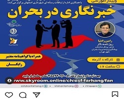 وبینار آموزشی " خبرنگاری در بحران " به همت اداره ارتباطات رسانه ای شهرداری اصفهان و فرهنگسرای رسانه سازمان فرهنگی، اجتماعی شهرداری اصفهان، روز هشتم آذر ماه ساعت 16 با تدریس رامین رادنیا برگزار می شود.