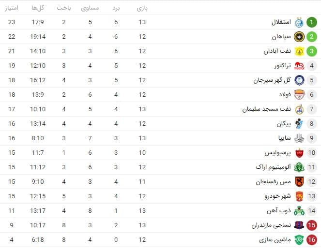به گزارش تابناک مازندران ، جدول لیگ برتر فوتبال در پایان روز نخست هفته سیزدهم|صعود 5 پله‌ای گل‌گهر و باقی ماندن استقلال در صدر .