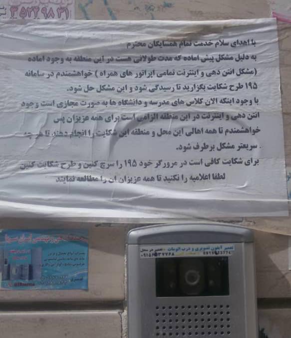 به گزارش تابناک رضوی، در متن این تومار درخواست تظلم خواهی در منطقه 12 مشهد درباره آنتن دهی ضعیف اپراتورهای پردرآمد تلفن همراه، آمده است: "به دلیل مشکل پیش آمده که مدت طولانی در این منطقه بوجود آمده از اهالی محله خواهشمندیم در سامانه ۱۹۵ طرح شکایت بگذارند تا به این مسیله رسیدگی گردد."