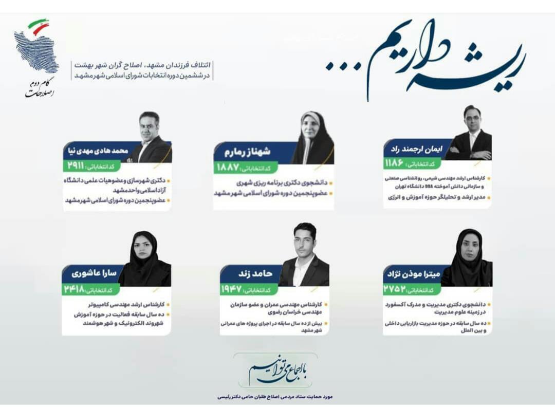 لذا ضمن احترام به ساختار جبهه اصلاحات؛ ائتلاف این لیست را نمادی جهت مخالفت با تنگ نظری ها و محدودیت ها در استفاده از ظرفیت نخبگان دانسته و ارائه آن جهت رساندن پیام تغییر به تصمیم گیران و تصمیم سازان این جریان در مشهد را ضروری می داند. امید است این لیست با همراهی مردم عزیز مشهد علی الخصوص متخصصین، جوانان و بانوان مورد اقبال قرار گرفته و حرکتی جدید در آغاز گام دوم انقلاب با رویکرد اصلاحی در حوزه مدیریت شهری باشد.