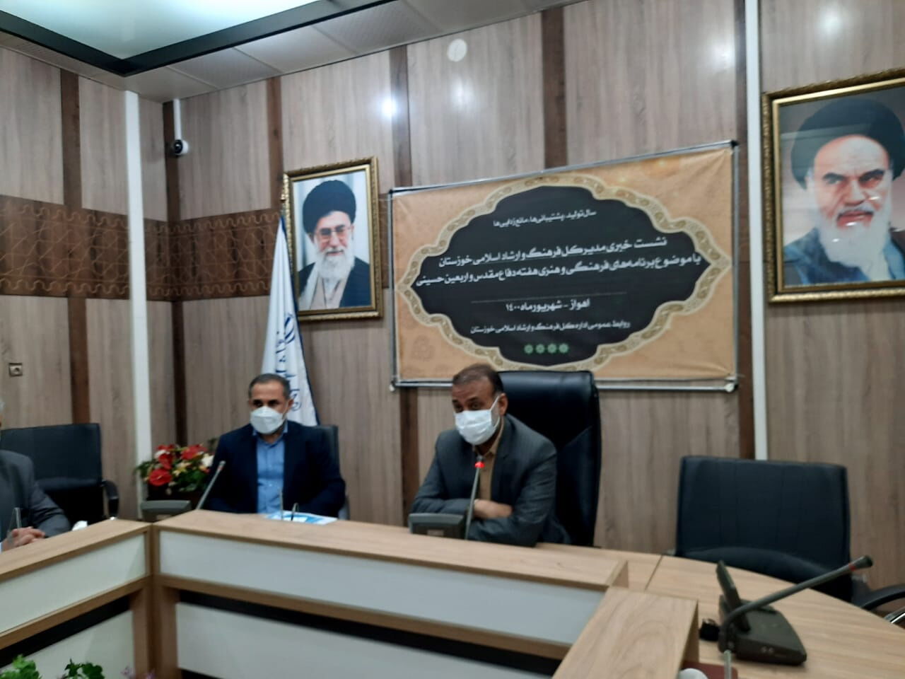 معاون هنری و سینمایی اداره کل فرهنگ و ارشاد اسلامی خوزستان نیز در این نشست با اشاره به فعالیت های این اداره کل به مناسبت فرا رسیدن اربعین حسینی و هفته دفاع مقدس افزود: برپایی موکب هنری هنرمندان با محوریت عکس و مد و لباس، طراحی لباس های تولید شده توسط هنرمندان ، همچنین برپایی گارگاه و نمایشگاهی از هنرمندان هنرهای تجسمی و خوشنویسی در اهواز از جمله برنامهها به این مناسبت است.